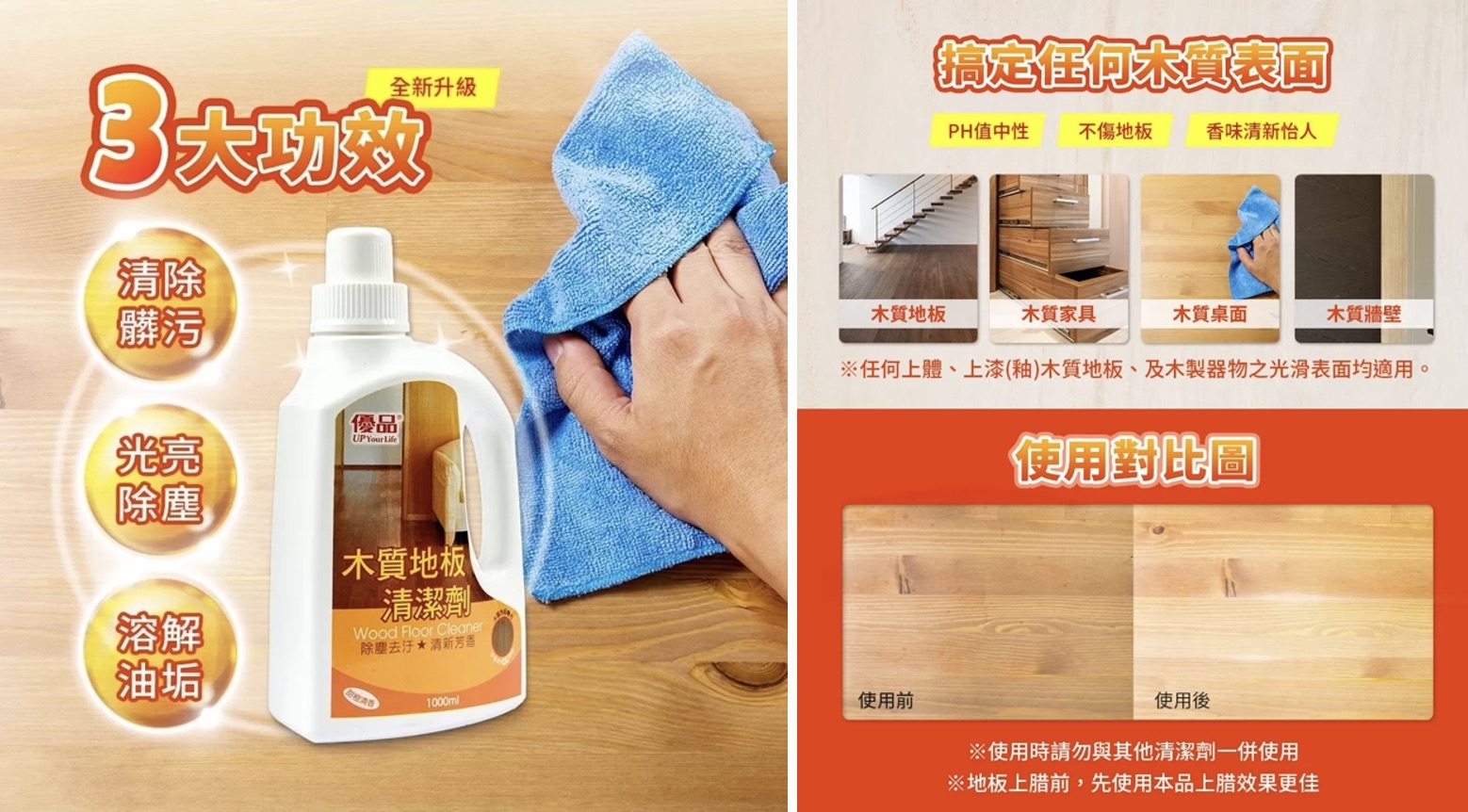 面對這些痛點,今年大掃除你其實有更聰明的選擇,優品木質地板清潔劑它不只是清潔劑,更是木質表面的護理專家,對付難纏髒污同時保護木質表面。